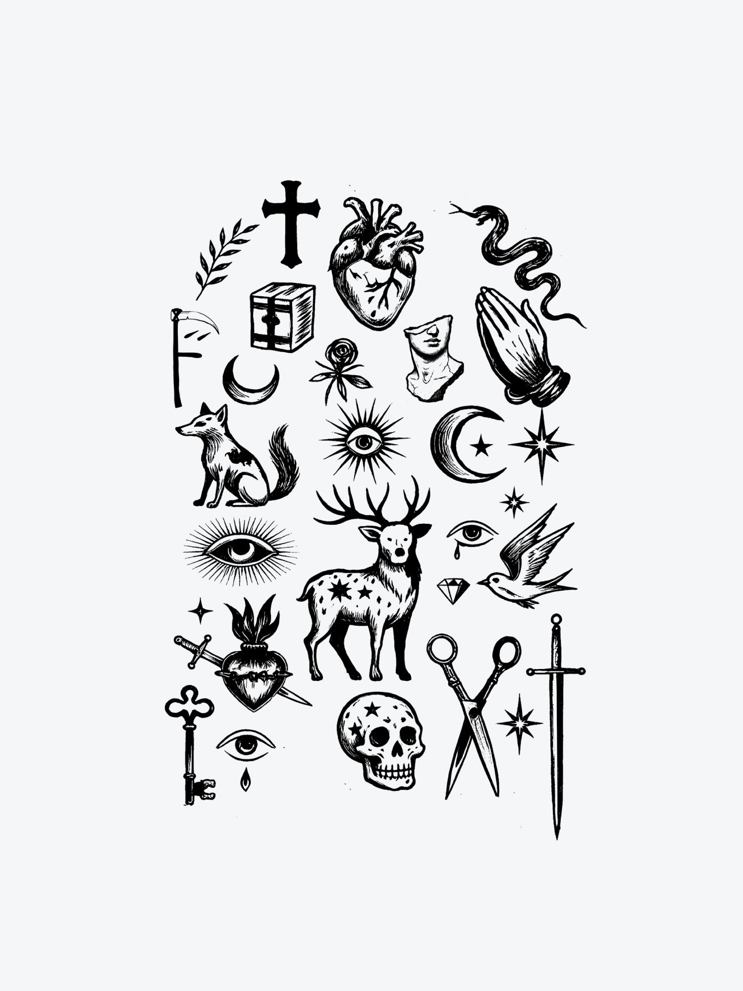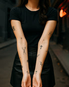 By contrast, Bundles feature multiple tattoos of a similar style, printed on one sheet so you can cut them out and arrange them however you like. While Shop The Look provides ready-made placement suggestions, Bundles give you the freedom to decide exactly how to place each tattoo for a more personalized